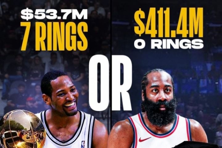 詹姆斯-哈登的(薪资)收入已经超过了4.11亿美元,但NBA生涯至今冠军数仍是0。