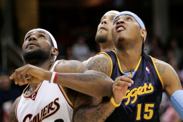 2003-04赛季,安东尼场均21分6.1篮板2.8助攻,掘金队最终43胜39负排名西部第8进入季后赛,詹姆斯场均20.9分5.5篮板5.9助攻,骑士队最终35胜47负未能进入季后赛。2003年最佳新秀评选,詹姆斯得分508分排名第一,安东尼得分403分排名第二。