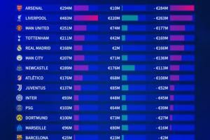 2025大俱乐部夏窗净投入排行(欧)