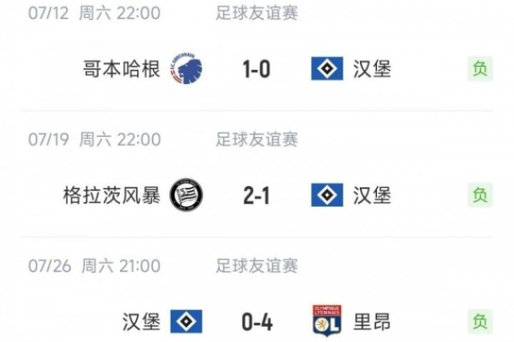 今夏的友谊赛,汉堡已经遭遇三连败了,三场比赛只进1球。刚升级德甲的汉堡这三场比赛分别是:0-1不敌丹超豪门哥本哈根,1-2不敌奥甲新贵格拉茨风暴,0-4不敌法甲豪门里昂。