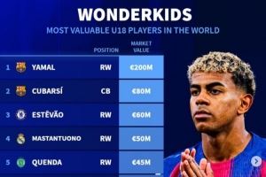 体育资讯11月10日讯 《转会市场》统计了当前世界足坛U18球员身价情况,亚马尔无悬念2亿欧独自领跑。